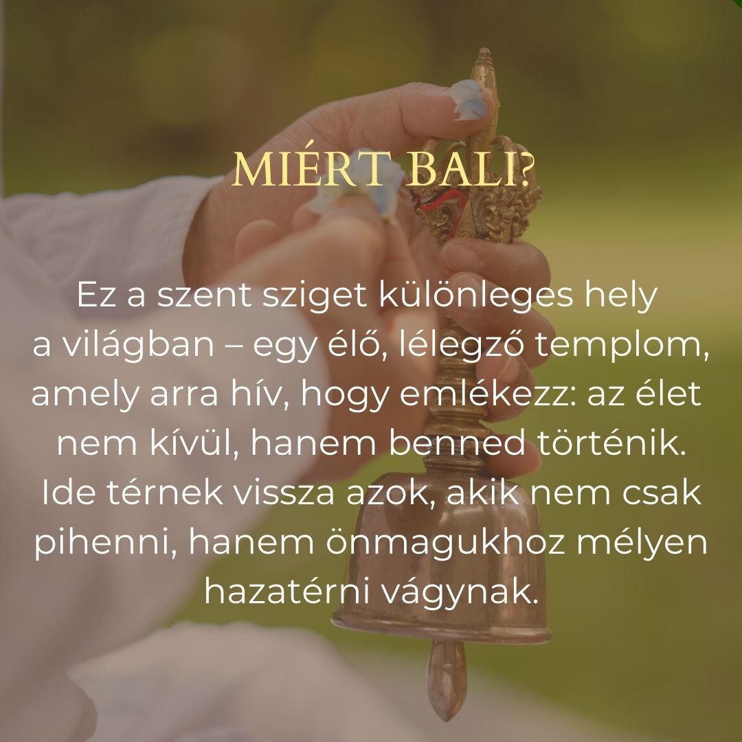 Bali templomainak szent tere, az ősi ceremóniák ritmusa és a mestereim generációkon át őrzött spirituális bölcsessége egy különleges teret hoz létre. Egy olyan teret, ahol az ember lecsendesedik, és újra kapcsolatba kerül a saját belső világával.