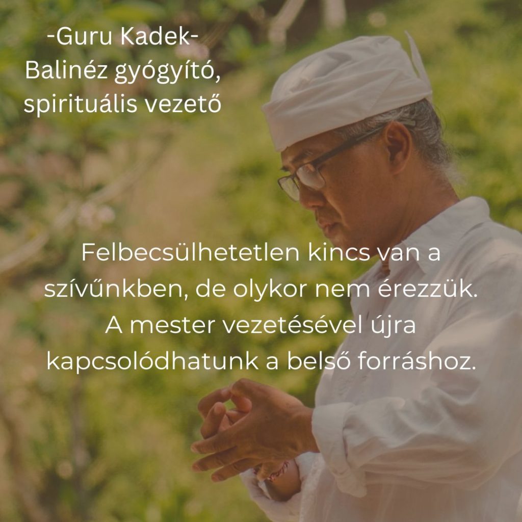 Guru Kadek a balinéz bölcsesség, a tradicionális szertartások és a spiritualitás legmélyebb rétegeibe vezetett be. Általa a balinéz szellemi hagyomány élő részévé válhattam. Itt nem a felszínt érintjük, hanem a szív és a lélek mélyét.