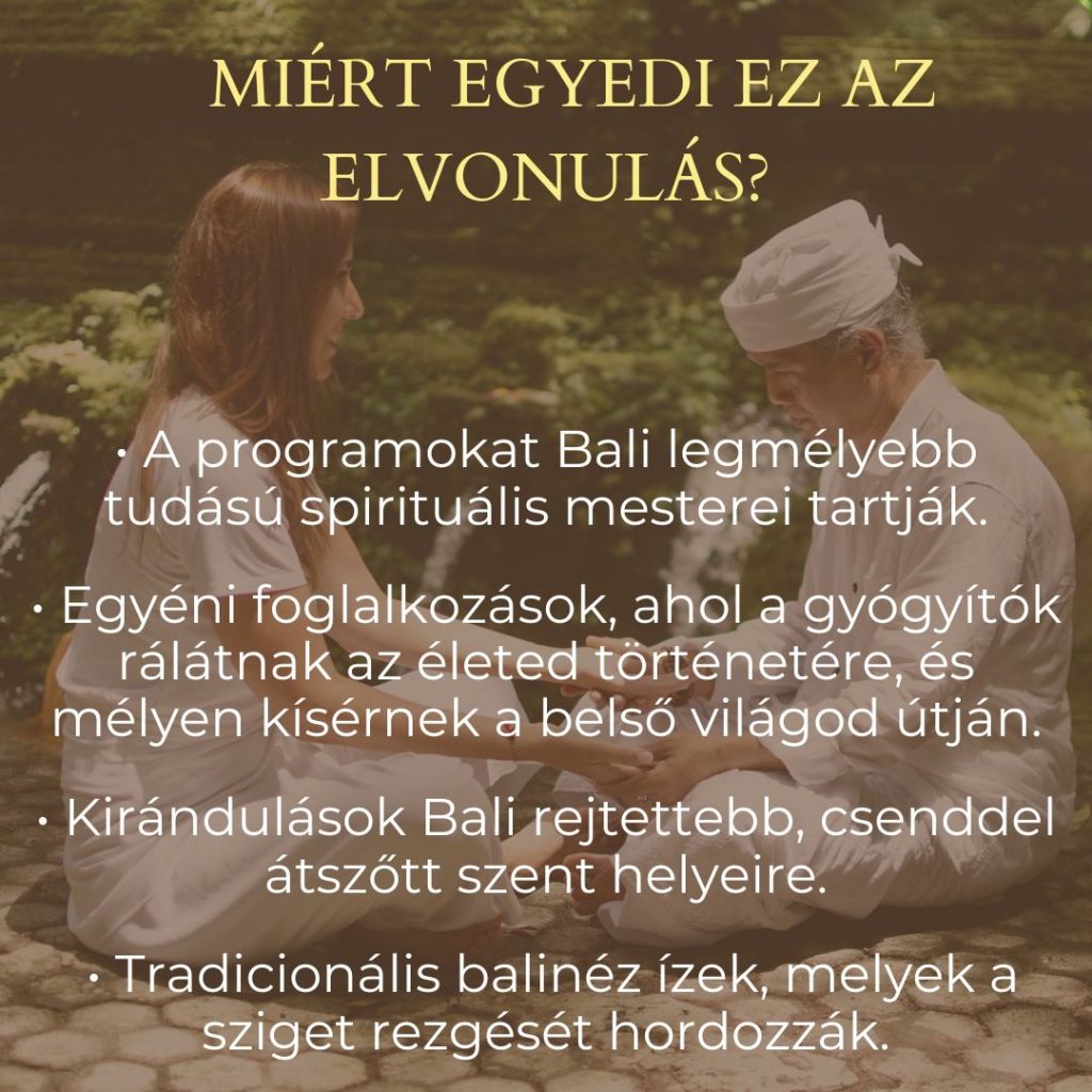 A balinézek között élve, egy rendkívüli világba kaptam meghívást, ceremóniák, gyógyítók, ősi rituálék világába. Nagy öröm számomra, hogy az elvonulások által mindezt megoszthatom a hozzám kapcsolódókkal.