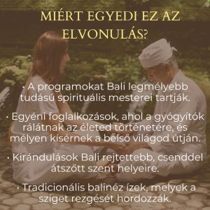 A 10 nap során Bali legkiválóbb mesterei és gyógyítói rendkívüli tudással, szakértelemmel vezetnek a belső világunk útján.